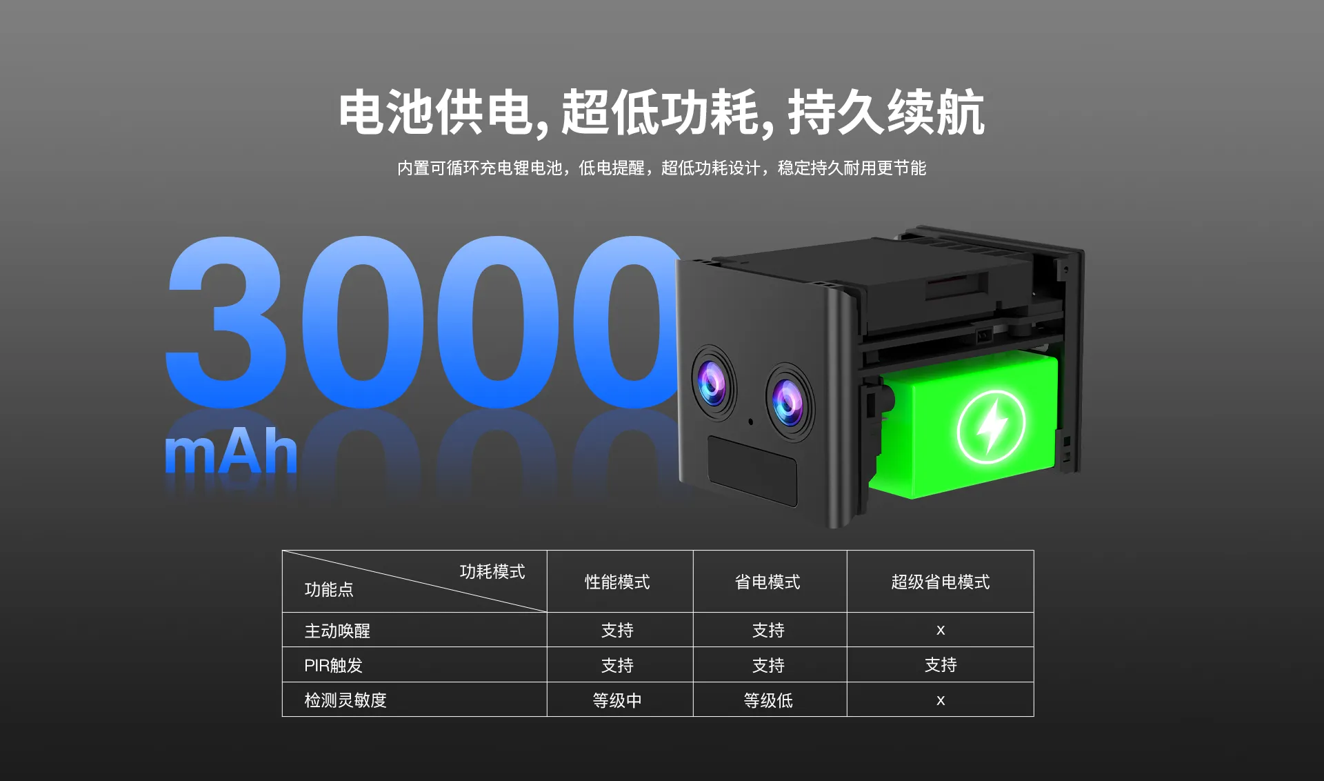 | 供电 | 自带3000mAh电池供电 | |
