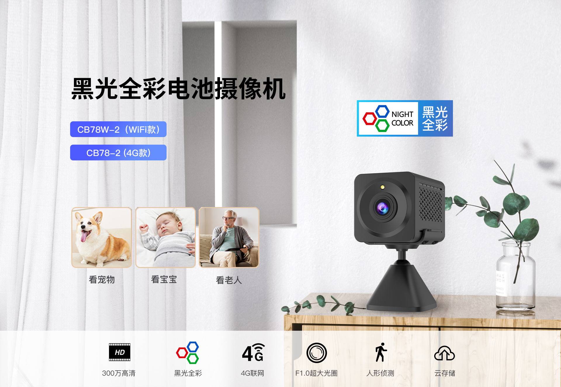 | ✮300W超高清,4G全网通高速模组,手机远程随时随地观看 | ✮300W超高清,WIFI配网,手机远程,随时随地观看 | |||||