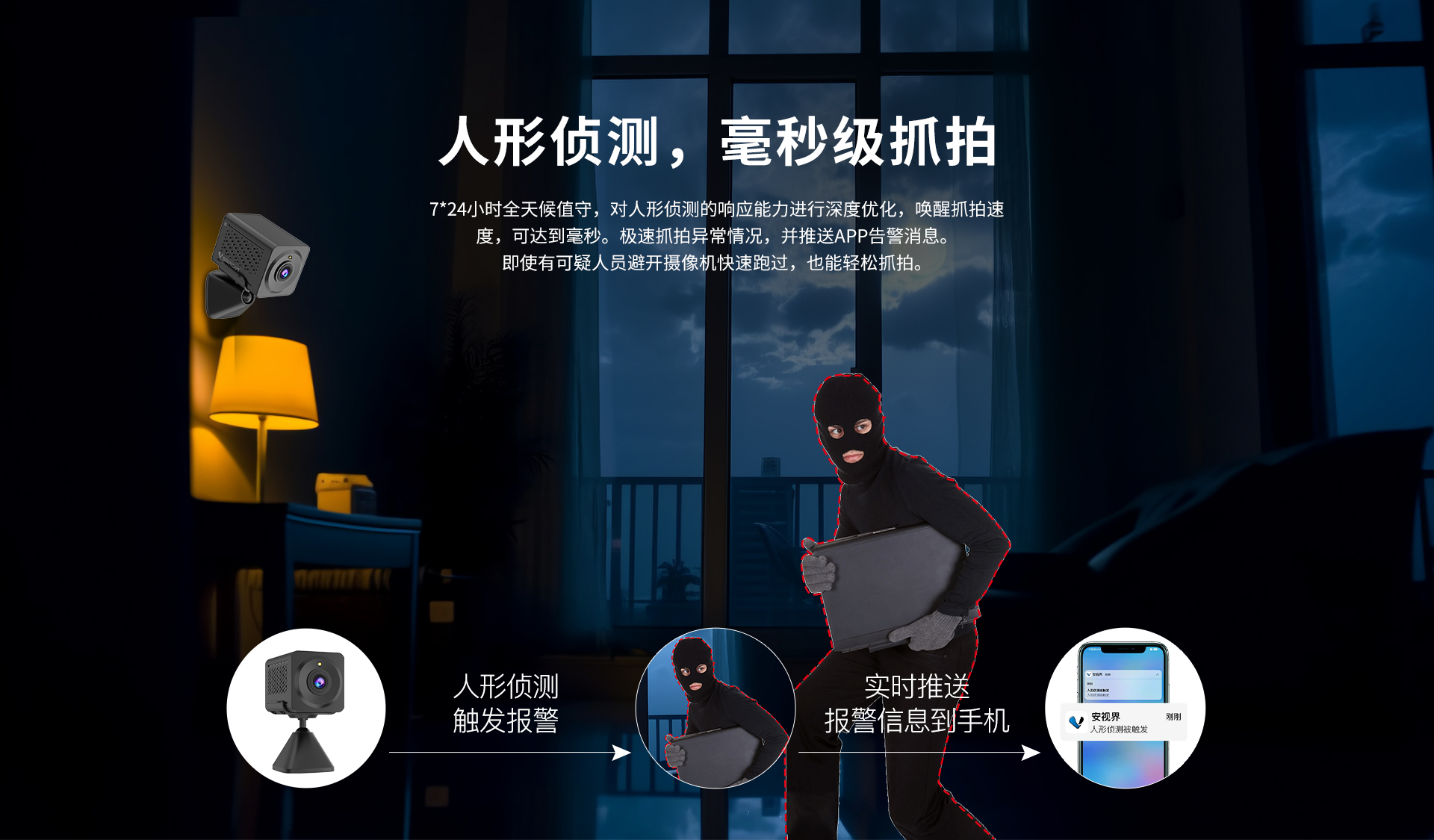 | 报警 | 报警检测 | 支持移动侦测,人形侦测,人形框定,警笛报警音,区域侦测 | 工作环境 | 工作温度:-10~55℃,工作湿度<90% | ||