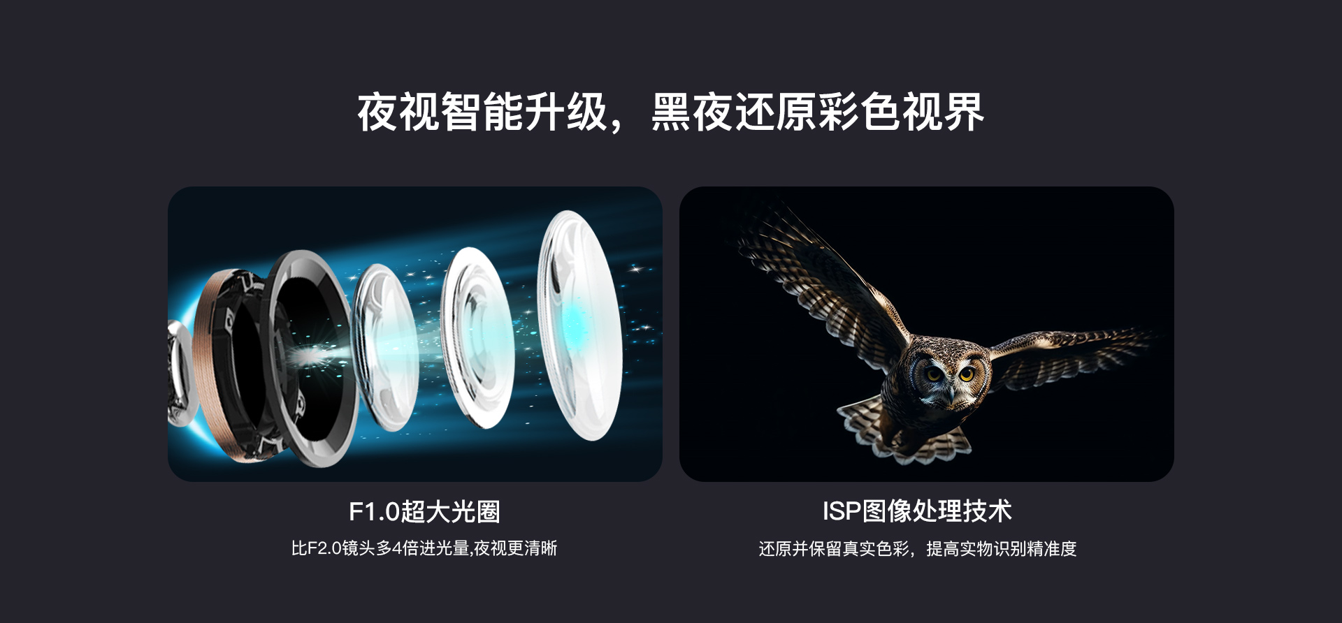 | ✮F1.0超大光圈,多4倍进光量,夜视更清晰 | ||