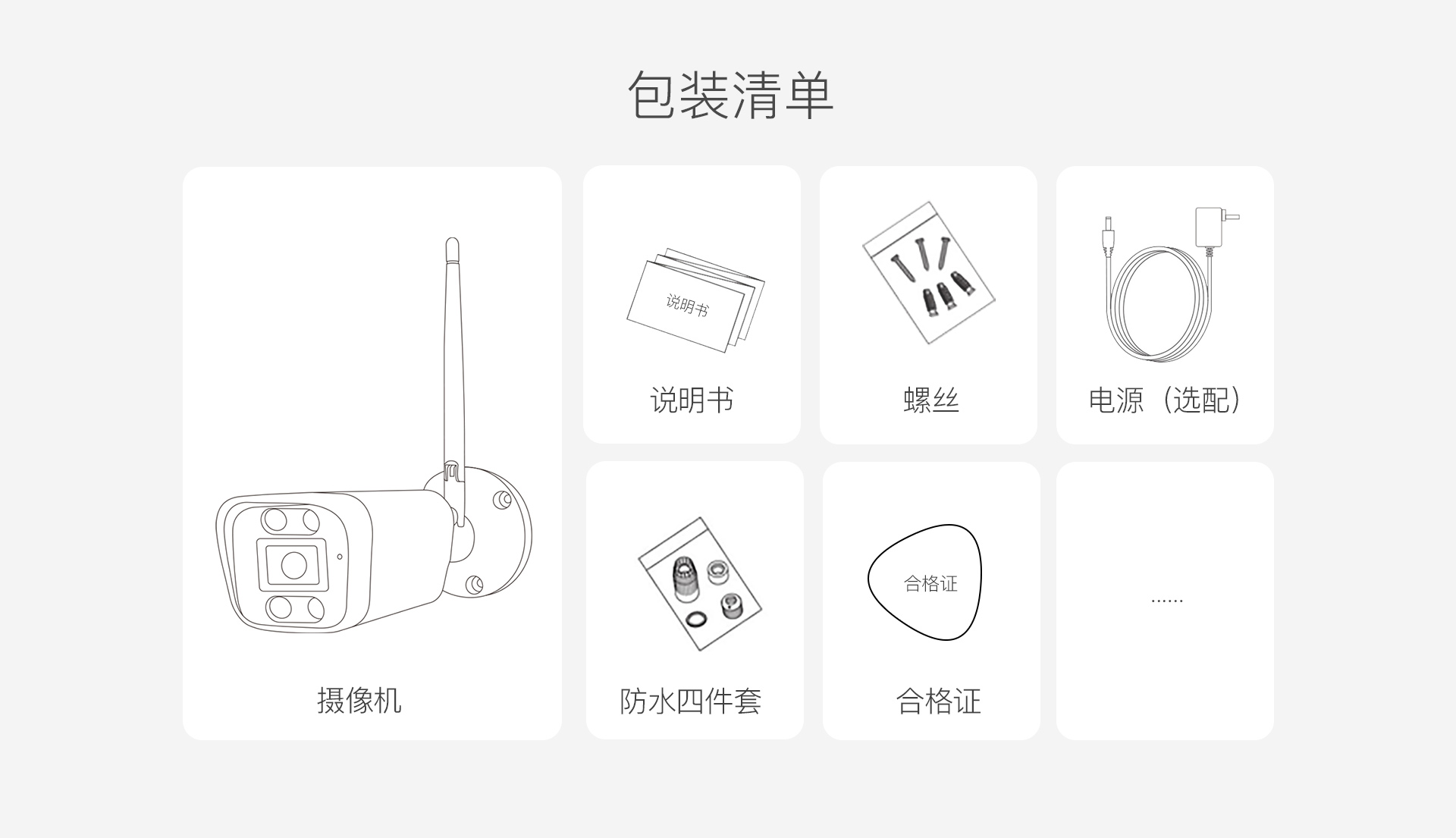 | 包装清单 | 摄像机,螺丝包,警示贴,内六角扳手,螺丝刀,说明书 | |