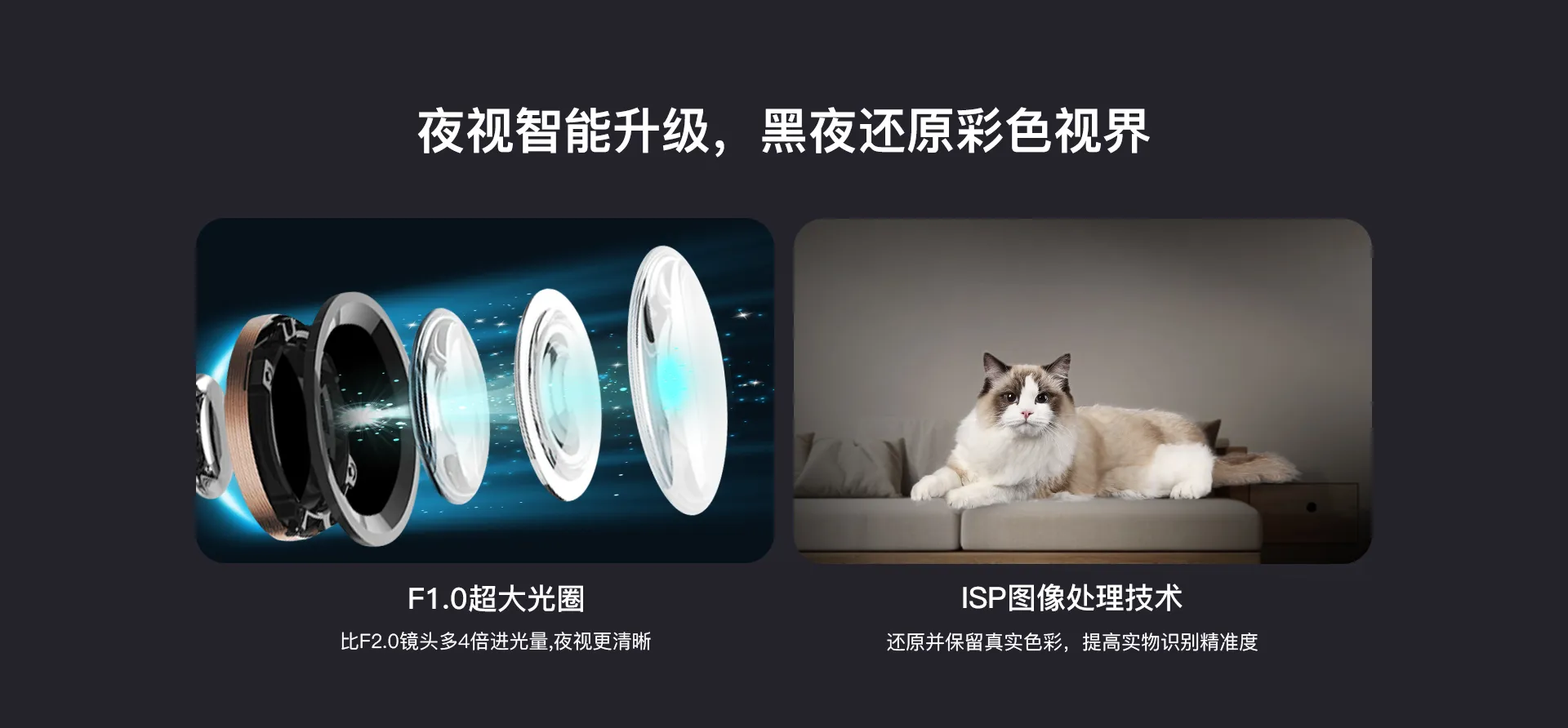 | ✮F1.0超大光圈,多4倍进光量,夜视更清晰 | ||