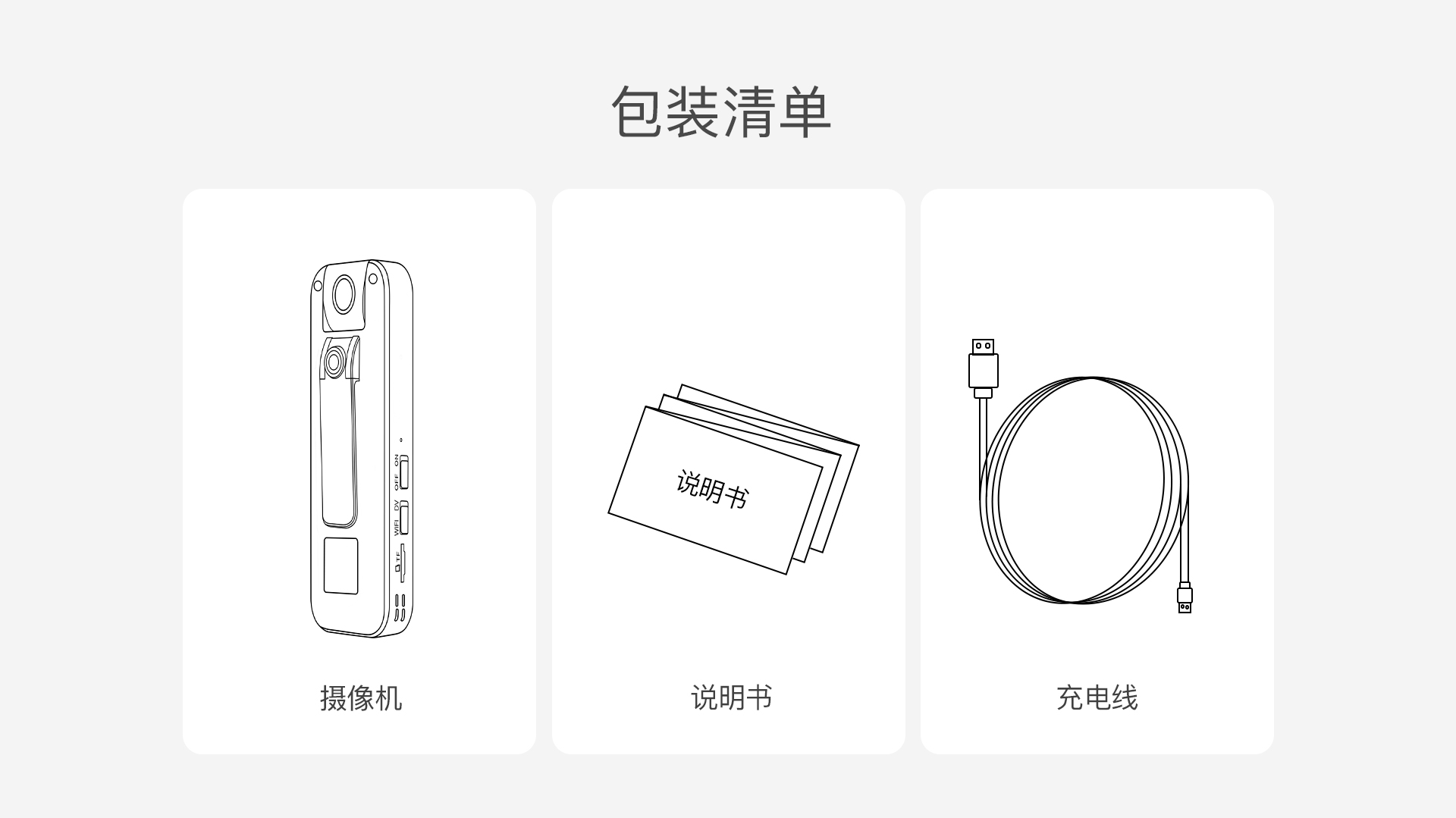 | 包装清单 | 主机*1,说明书*1,充电线*1,扎带*2,魔术贴*2 | |