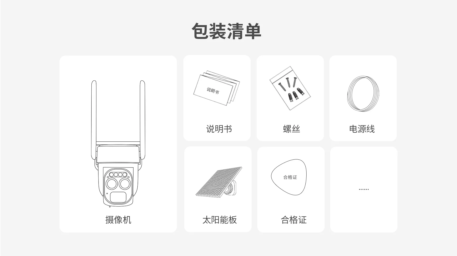 | 包装清单 | 主机*1,螺丝包,MICRO USB*1,说明书*1,(太阳能板*1,太阳能板支架*1 选配) | |