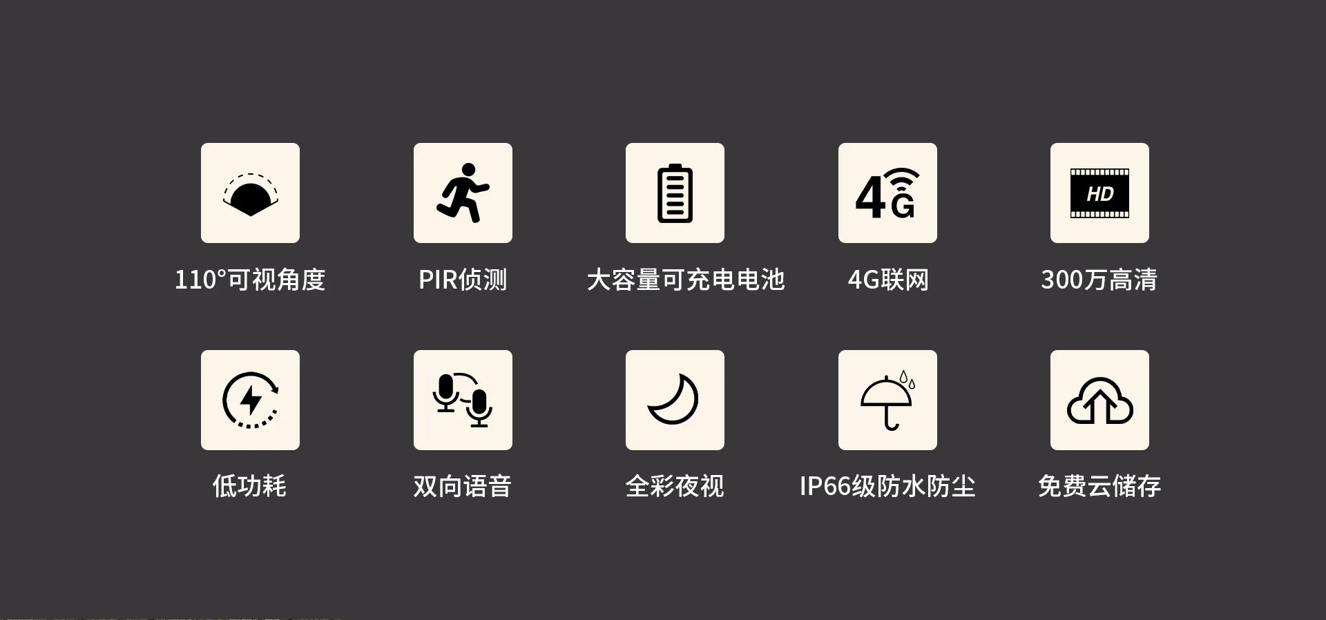 | 包装清单 | 主机*1,支架*1,螺丝包*1 ,说明书*1,绑带*1(选配:Type-C充电线*1,太阳能板*1,太阳能板支架*1 ) | |