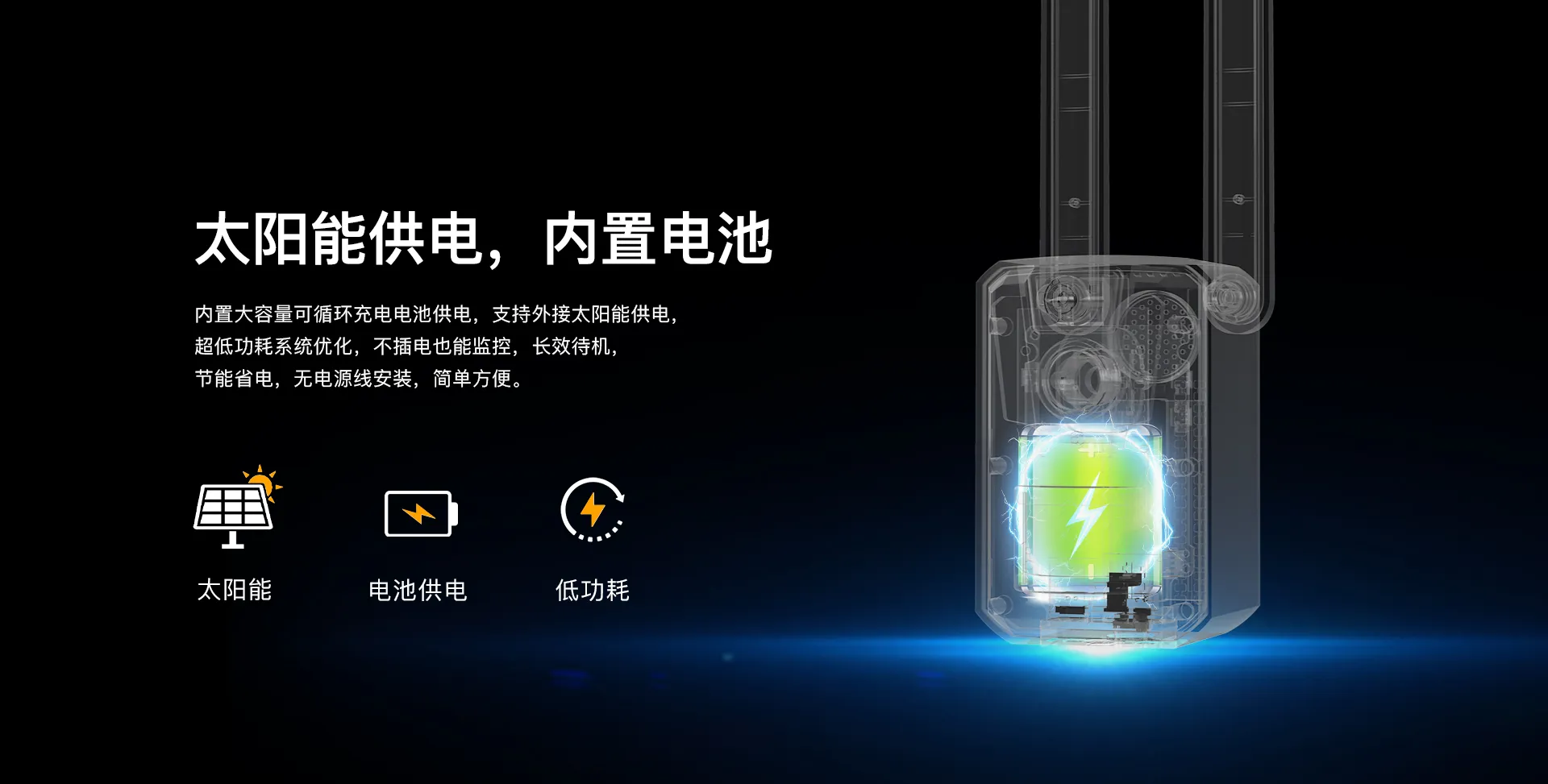 | 供电 | 自带5200mAh电池供电,2*18650,支持外接太阳能板(最大支持2节21700) | |
