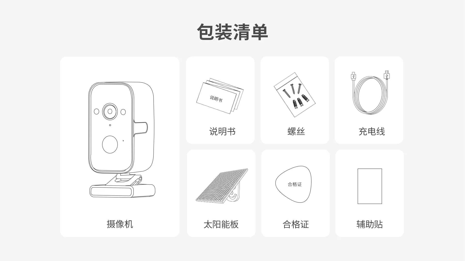 主机*1(含支架),螺丝包*1 ,说明书*1,铁片*1,免钉胶*1,辅助贴*1(Type-C充电线*1,太阳能板*1,太阳能板支架*1 选配) |