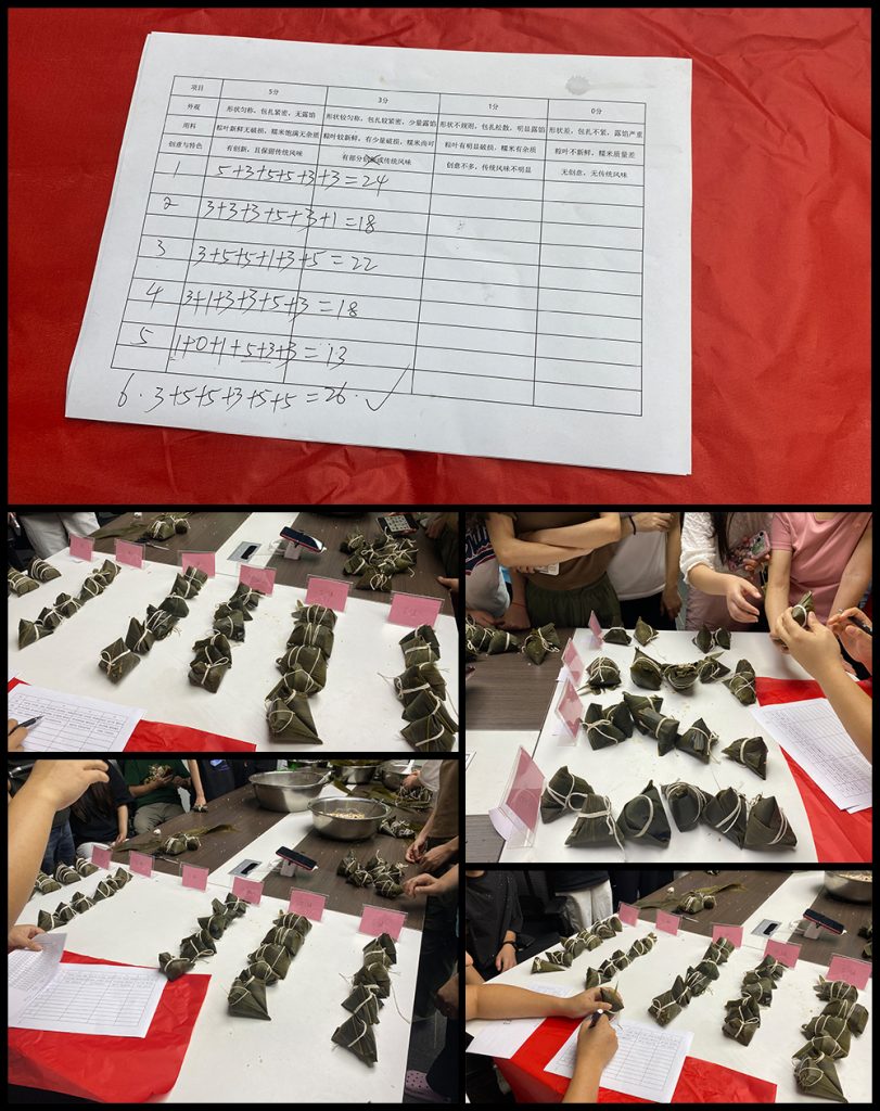 经过30分钟的角逐,桌面堆满了粽子,有长粽、三角粽子,形态各异。选手们分享着各自包粽子的经验,一起聊起端午节的由来及屈原的爱国情怀,一起包裹浓浓情谊、饱满清香的粽子,传递节日的温馨与安康。裁判从美观、质量、数量三个方面,评出一等奖、二等奖、三等奖并给选手们送上锦旗和惊喜。