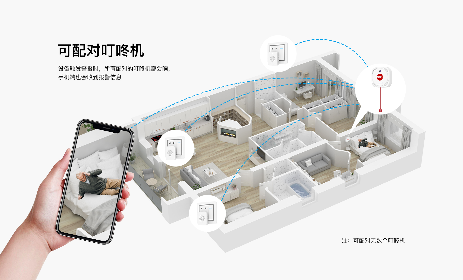 多端互联:设备触发警报时,所有配对的叮咚机都会响,子女手机端也会收到报警信息。