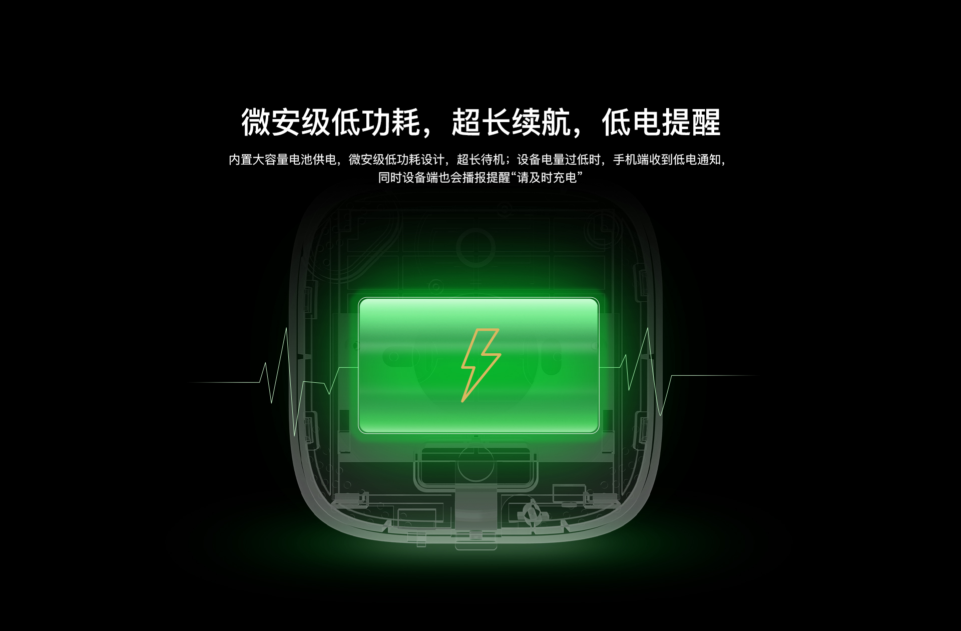 微安级功耗:内置大容量电池供电保障365天续航,微安级低功耗设计,超长待机;设备电量过低时,手机端收到低电通知,同时设备端也会播报提醒“请及时充电”。