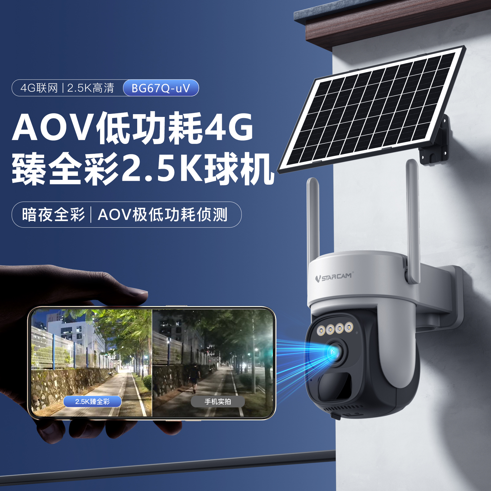 BG67Q-uV 太阳能黑光全彩4G高清摄像机:人形侦测、黑光全彩高清画面、太阳能供电、4G联网,适用于无网络覆盖的果园/仓库。