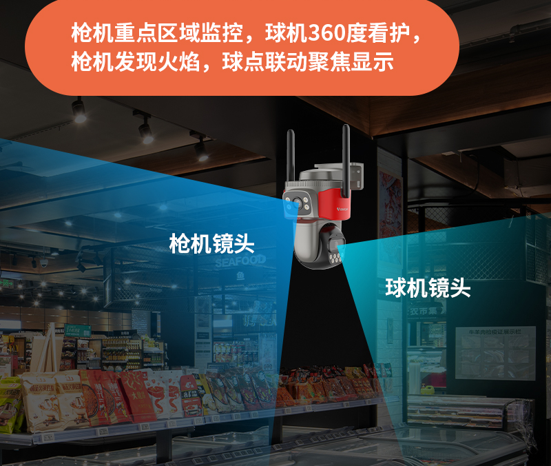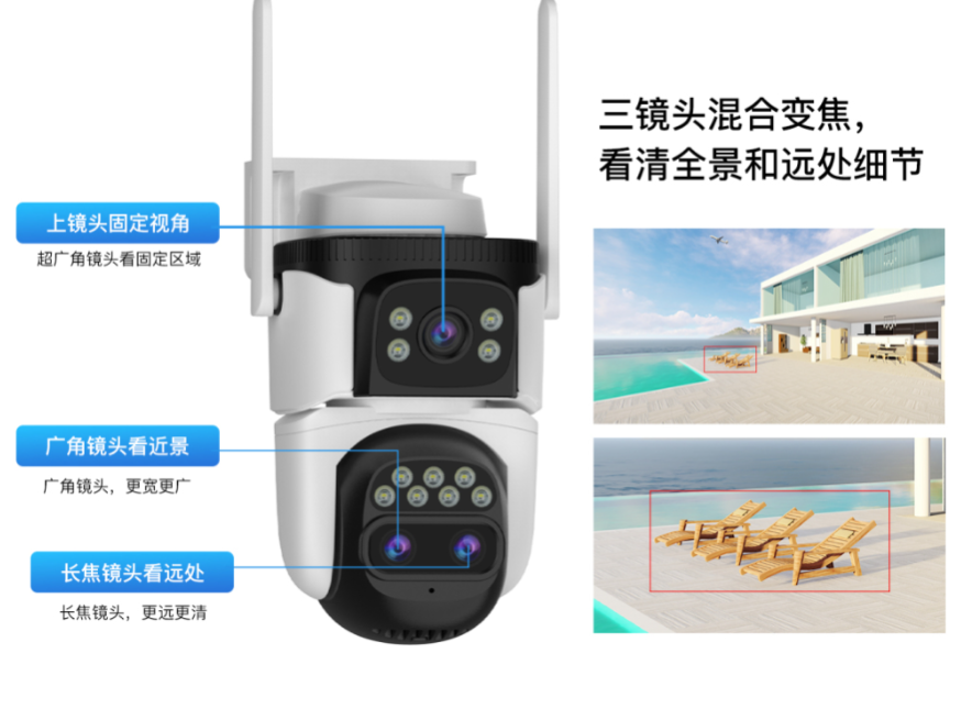 三镜头摄像机CS621ZR通过广角(全景镜头)+变焦(可缩放看细节)镜头组合,上下左右旋转云台实现全方位立体覆盖重要区域,消除监控盲区。