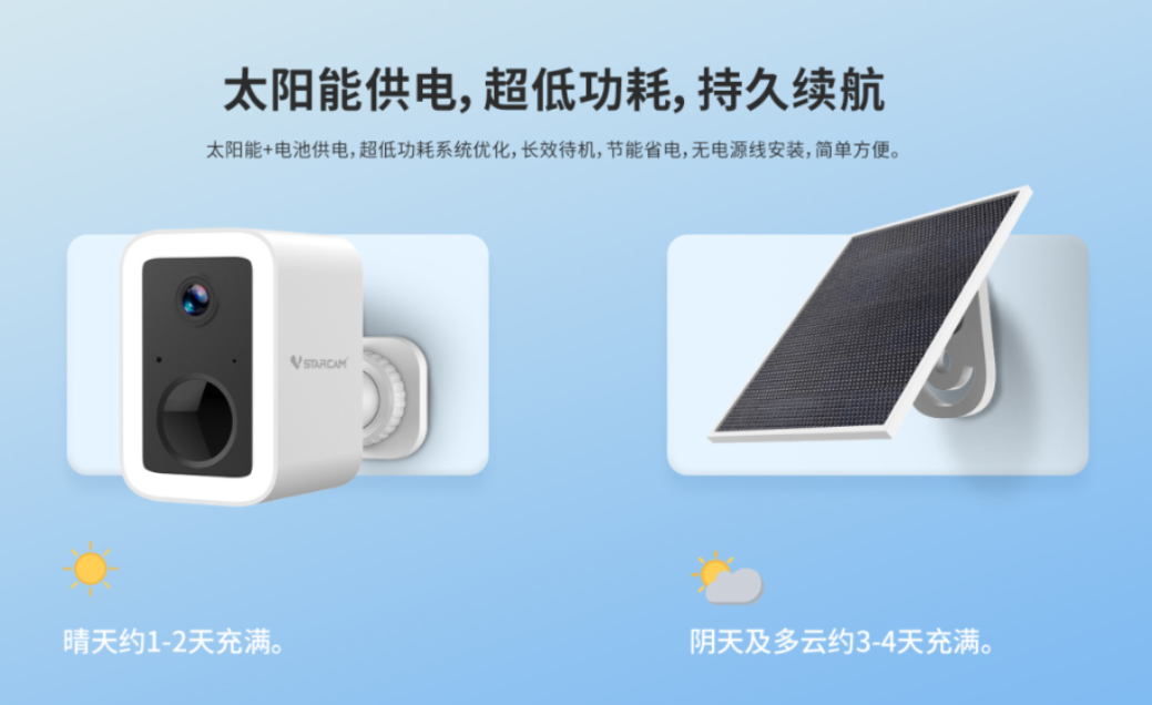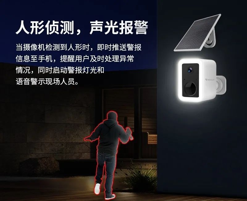 太阳能泛光灯摄像机CB554——你家门口的24小时保安。白天晒晒太阳就能充电,低功耗模式监控210天,阴雨天也不怕!
