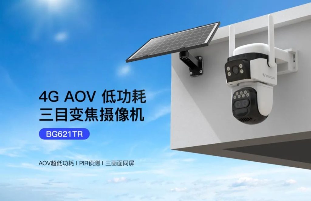 太阳能4G三镜头变焦摄像机BG621TR,三画面同屏观看与10倍光学变焦,采用AOV全时录像极低功耗设计,太阳晒够4小时即充满电量,低功耗模式持续工作75天,IP66防水设计完美适配果园、工地等复杂环境;