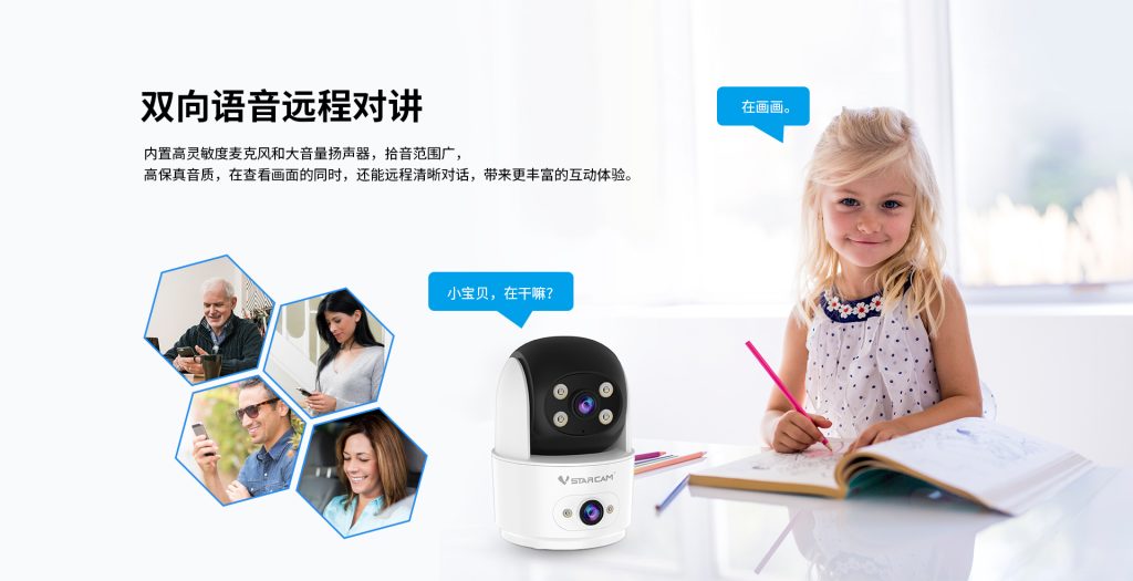 ● 双镜头双云台:上下左右独立旋转,看护多个区域。