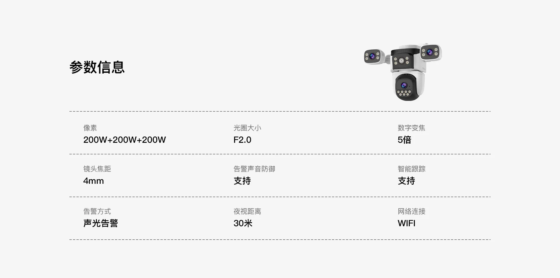 | 报警 | 报警检测 | 支持移动侦测,人形侦测,人形框定,区域侦测,警笛声报警 |