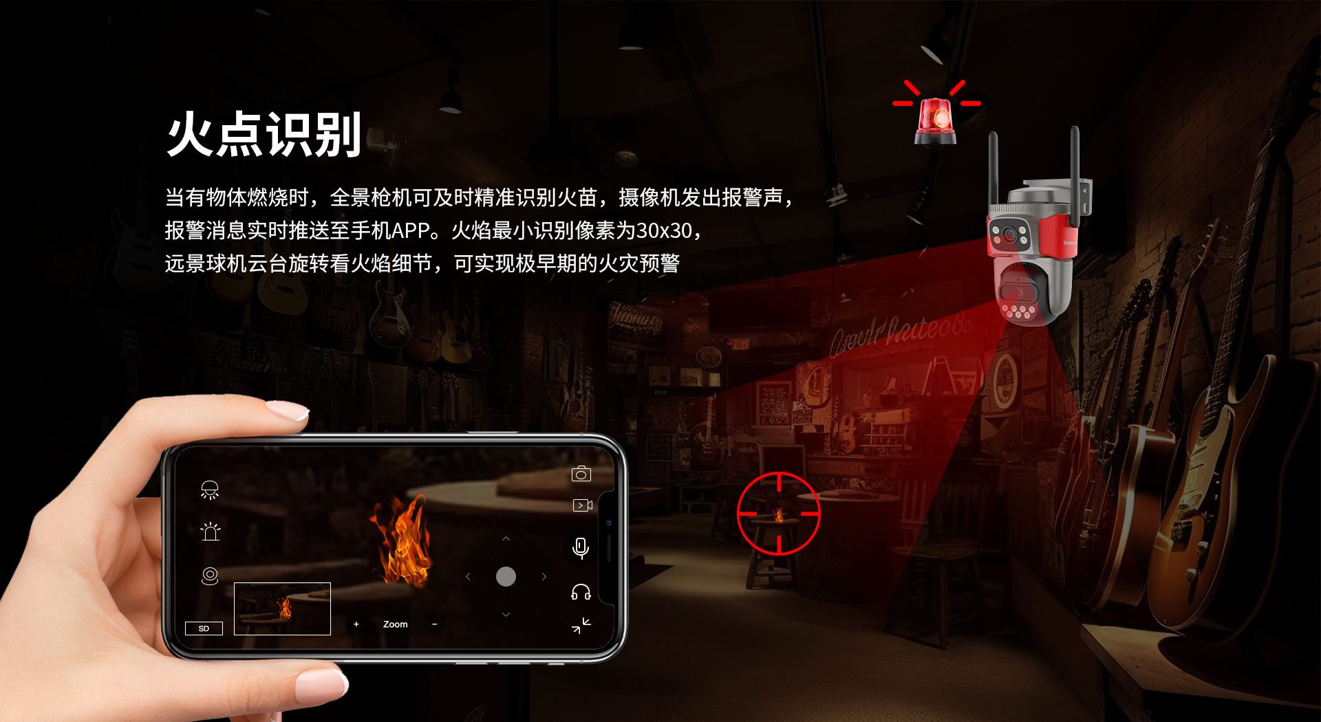 | 报警 | 报警检测 | 支持火焰检测,移动侦测,警笛报警音,区域侦测 |