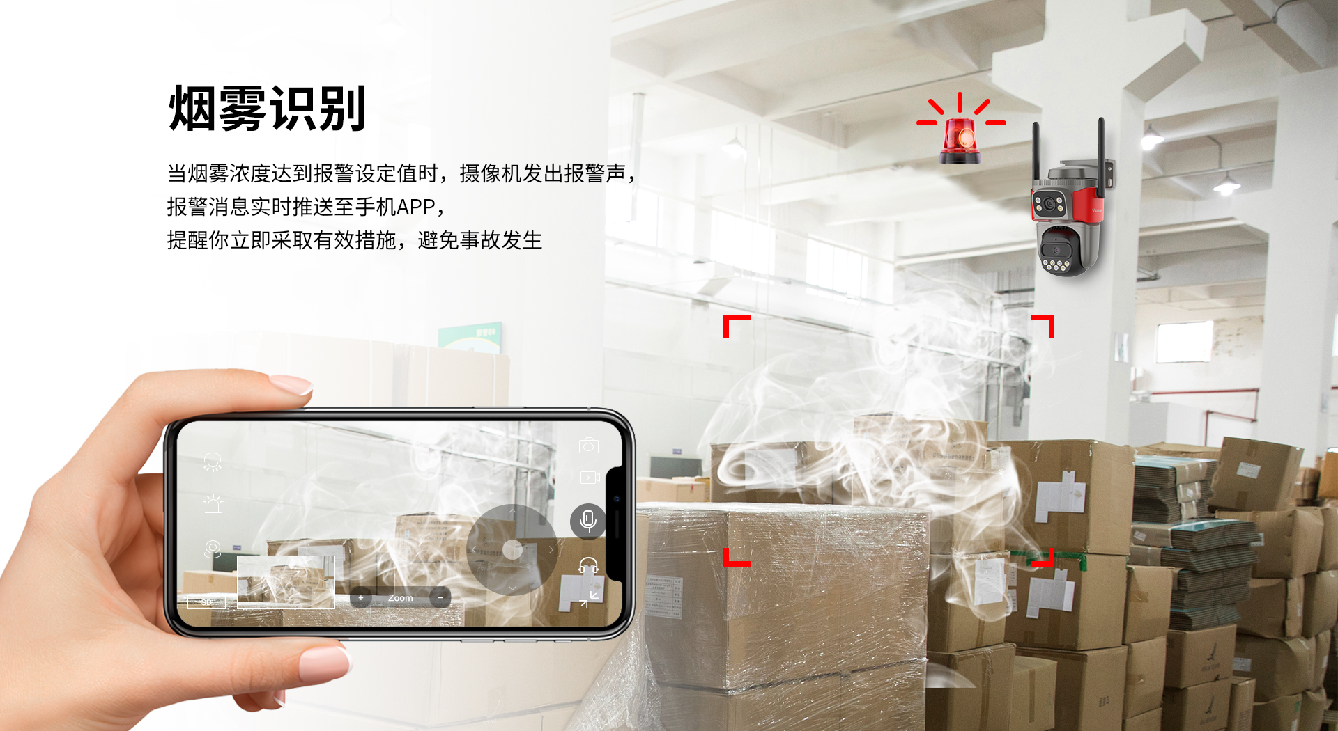 | AI | 烟火检测 | 明火及烟雾检测框定,直接定位火点位置.火焰最小像素:30X30像素,持续时间3秒以上; 可识别火焰颜色:红外、橙色、黄色; 建议安装高度:3米; 检测率:90% |