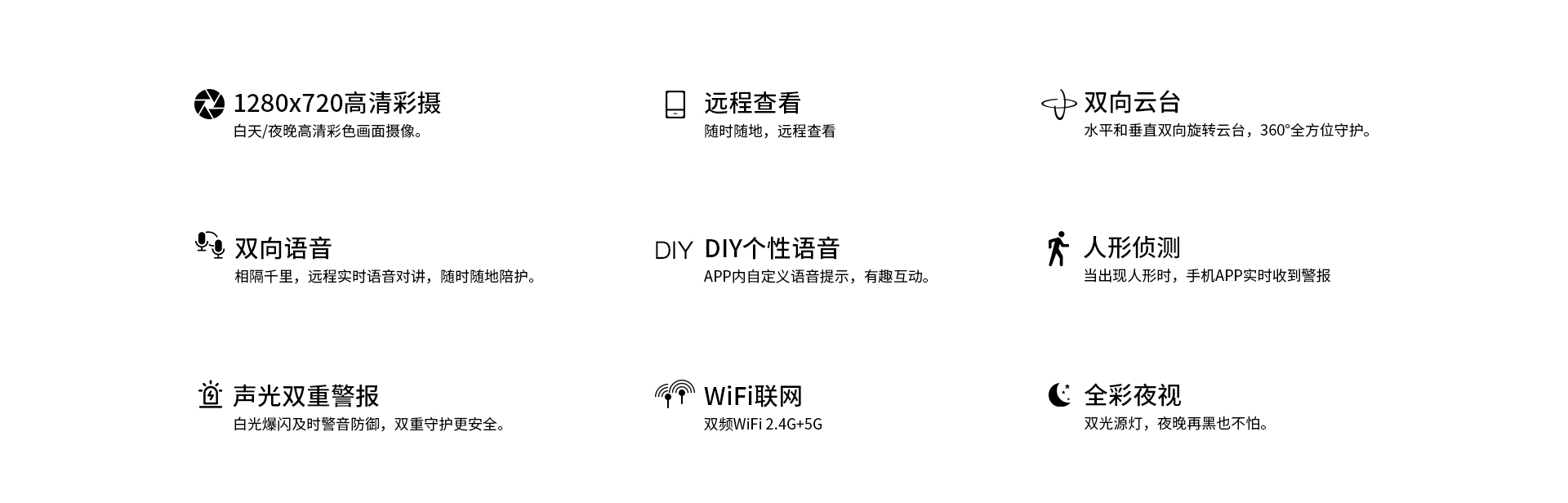 | 报警 | 报警检测 | 支持移动侦测,人形侦测,人形框定,区域侦测,人形追踪 |