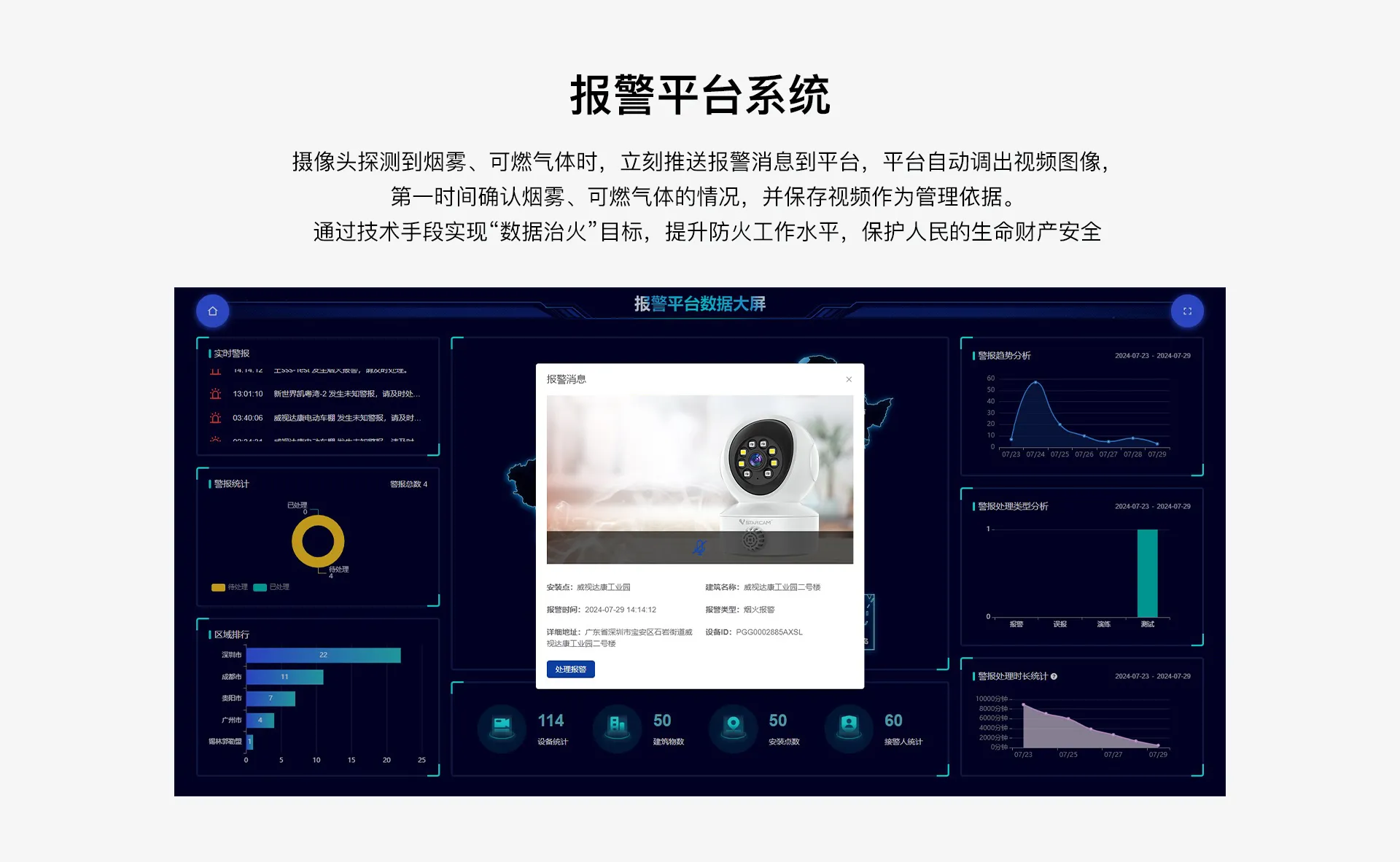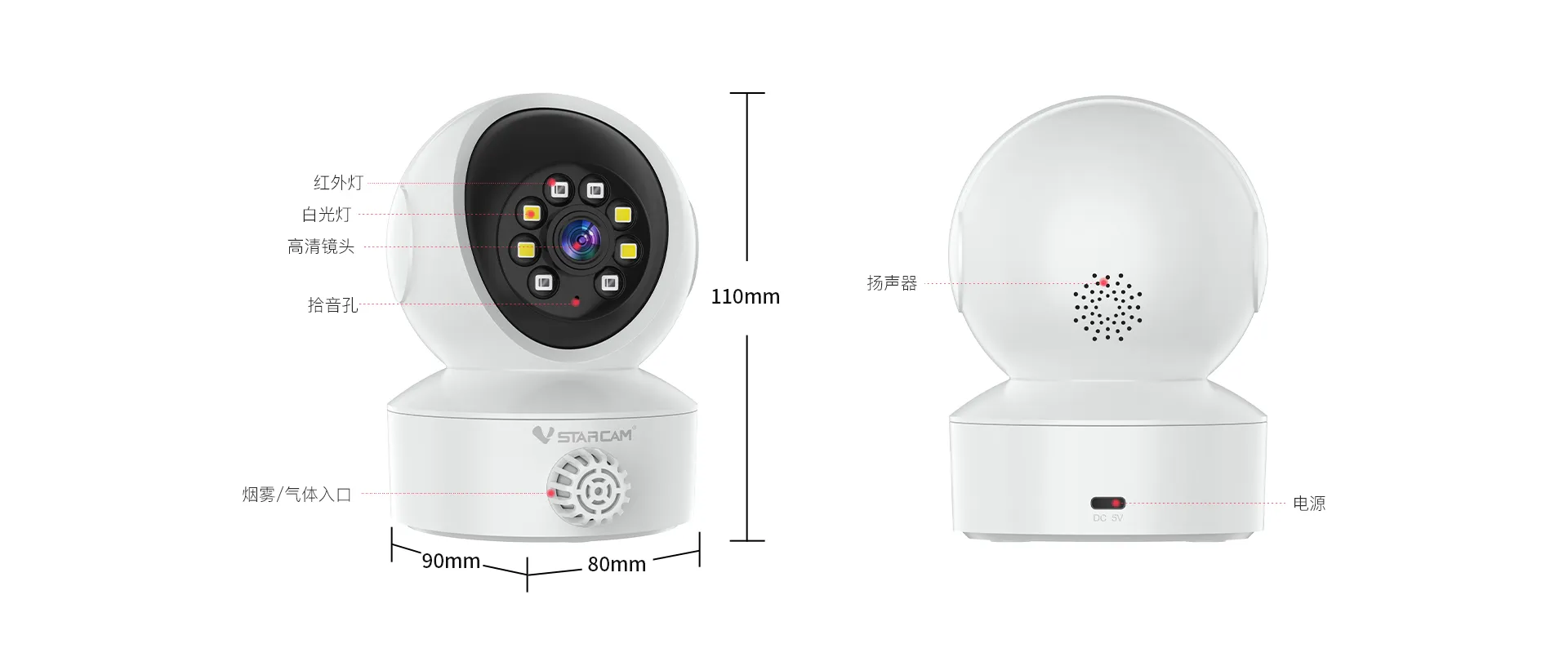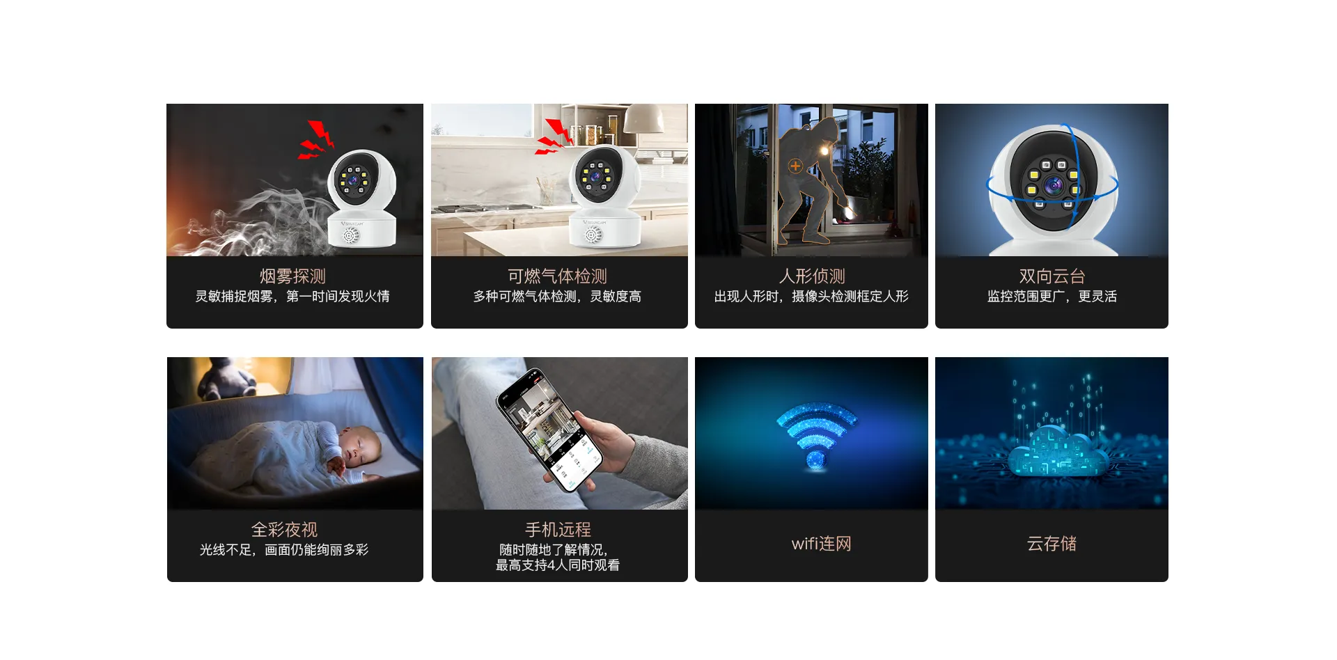 | 报警 | 报警检测 | 支持烟雾探测、可燃气检测、移动侦测,人形侦测,人形框定,区域侦测,人形追踪 |