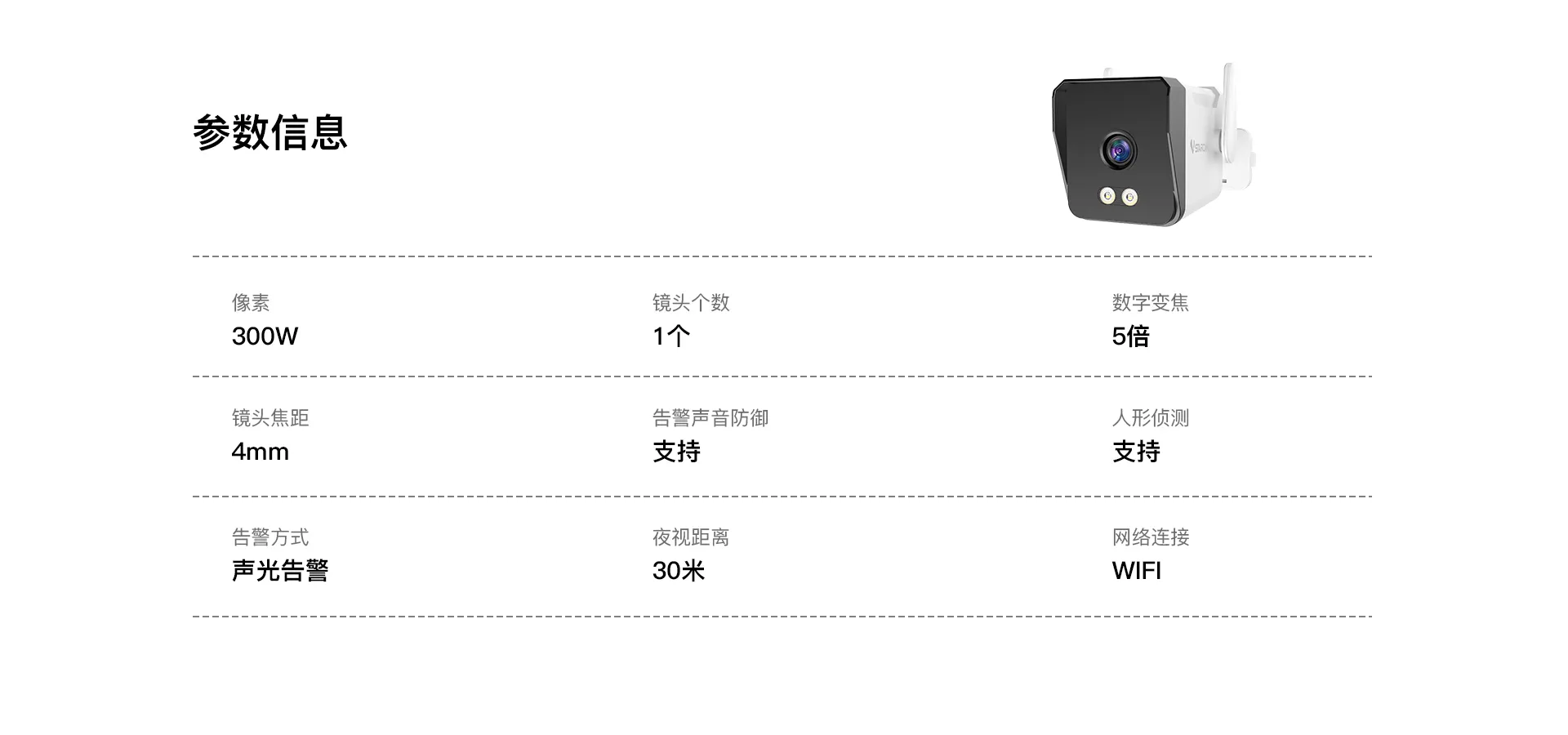 | 报警 | 报警检测 | 支持移动侦测,人形侦测,人形框定,区域侦测 |